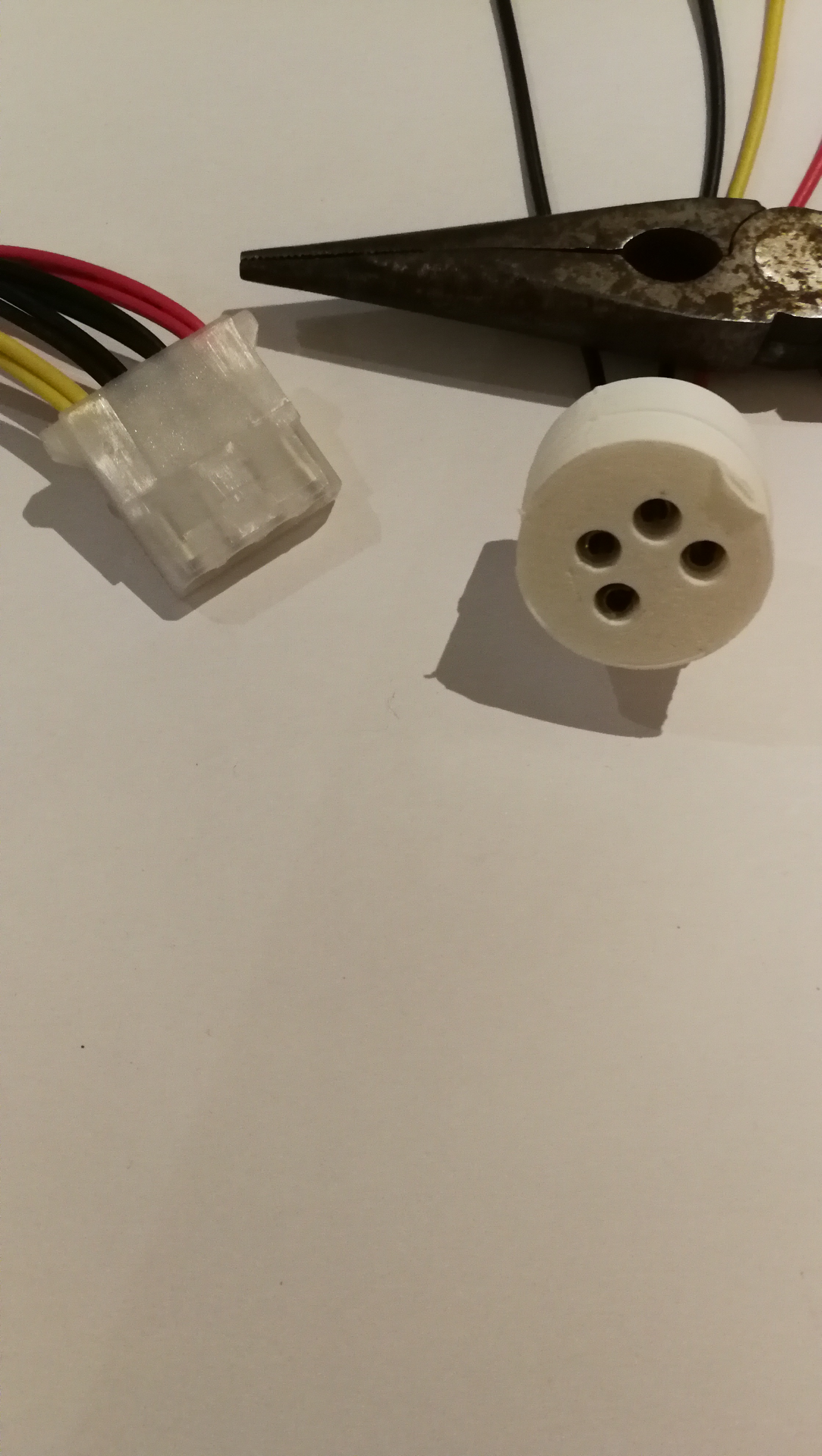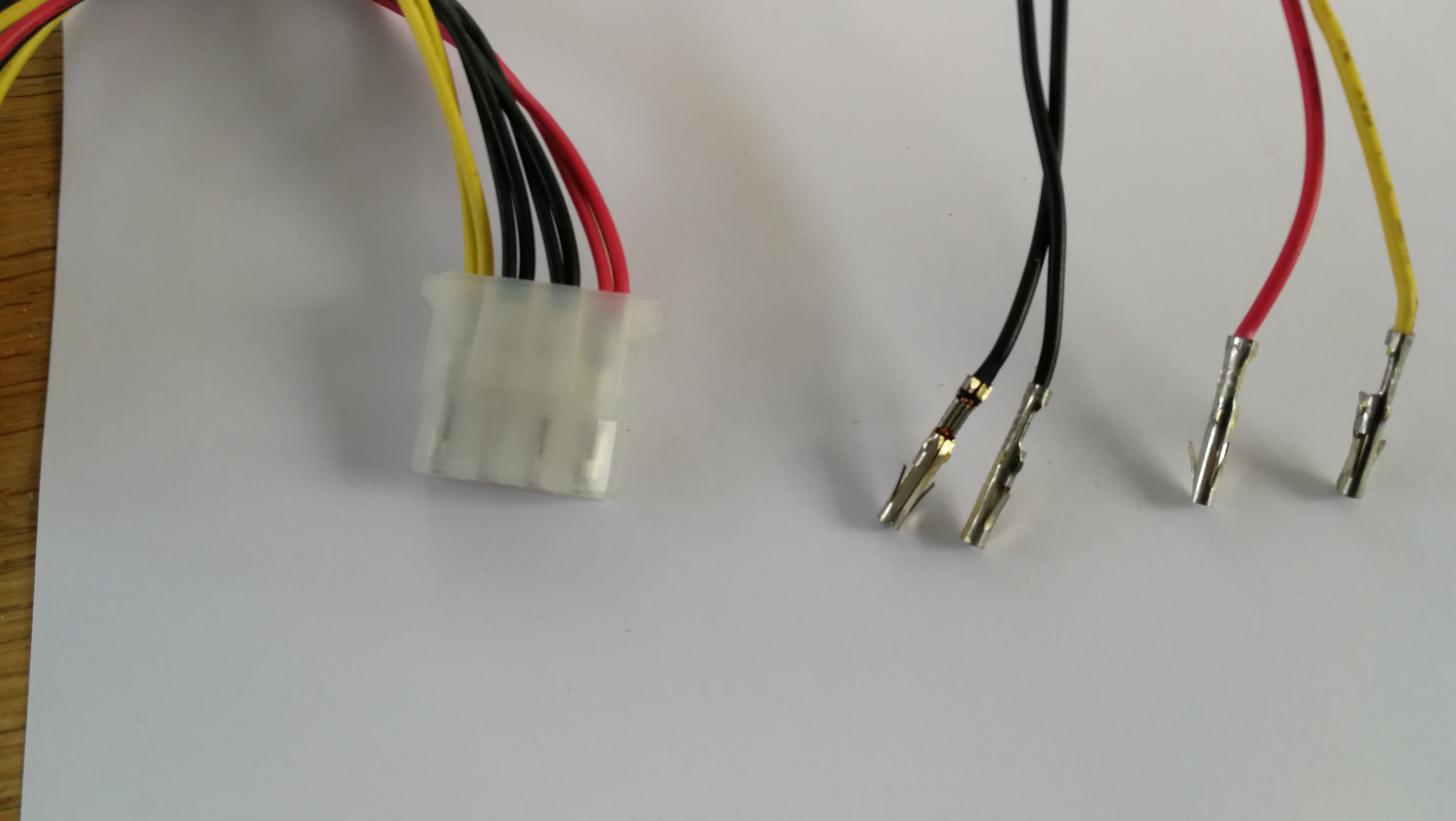 I canibalised an old PC PSU, and ground down the plastic on the disk connector and thus got the pins out, 3D printed a kind of pin holder - not breaking any of mr molexes patents.